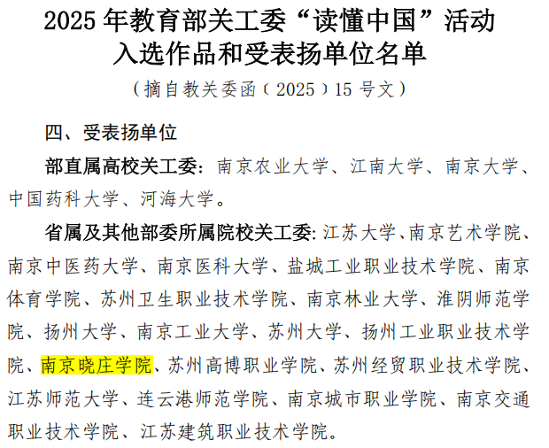 12月16日,省教育系统关工委发文公布2025年“读懂中国”活动入选作品名单,我校关工委选送的征文《一位老教授大爱奉献的特别教育人生》获评优秀征文奖、微视频作品《以音乐为舟,载育人之魂》获评优秀微视频奖。同时,我校关工委也获得教育部关工委2025年“读懂中国”活动表扬单位。